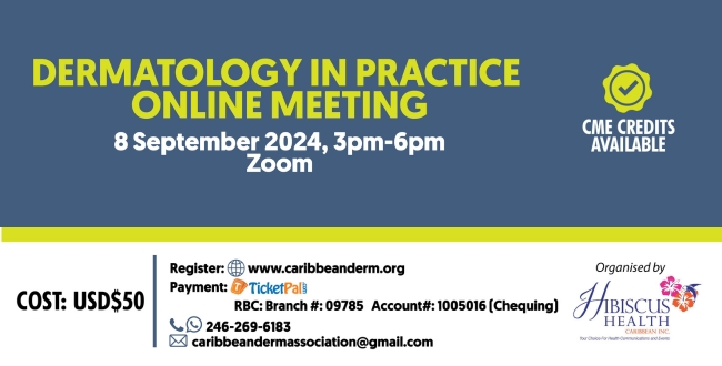 The Caribbean Dermatology Association (CDA) invites you to the “Dermatology in Practice Online Meeting” on 8 Sept 2024, 3pm – 7pm via…